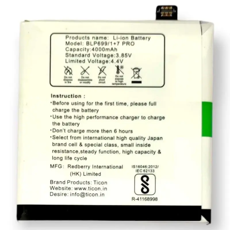 The 1+7 Pro/OnePlus 7 Pro BLP699 showcases a cutting-edge Ticon Li-ion battery, delivering a formidable 4000mAh capacity at 3.85V. This powerhouse battery ensures enduring performance, facilitating extensive usage without frequent recharging, providing users with an uninterrupted, reliable mobile experience.