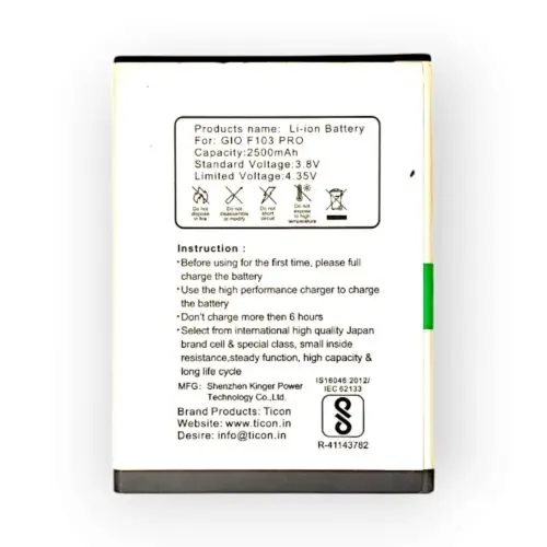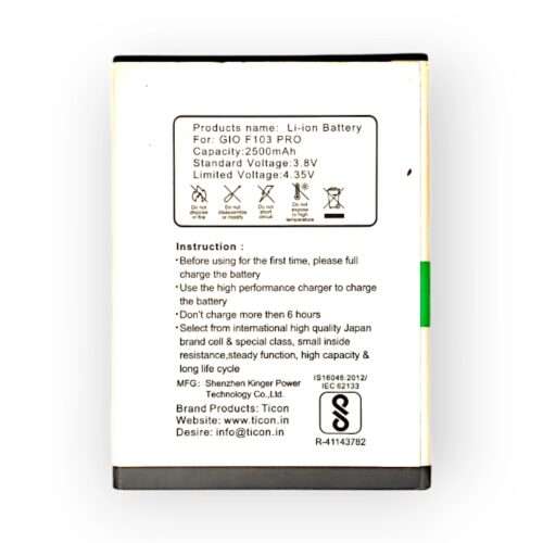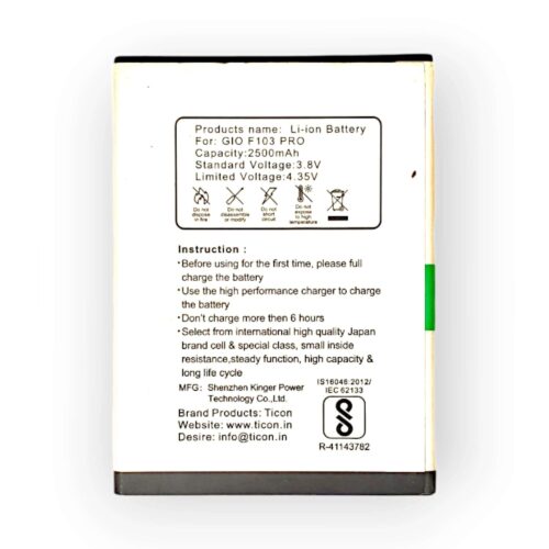The Ticon Mobile Battery for GIONEE F103 PRO is a high-quality replacement battery designed to provide long-lasting power for your GIONEE F103 PRO smartphone. This battery offers a reliable and durable solution for extending your device’s battery life.
