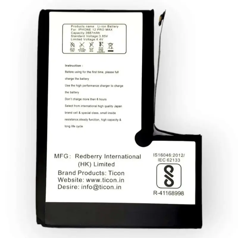 The iPhone 12 Pro Max is equipped with a high-performance Ticon Li-ion battery, featuring a 3687mAh capacity and operating at 3.85V. This advanced battery technology ensures optimal power efficiency, delivering a seamless and enduring mobile experience for users of the iPhone 12 Pro Max.