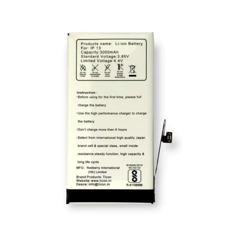 Ticon Battery For Apple iPhone 13 Mobile Battery High Quality Power Up For 3.85V/3000mAh & Apple iPhone 13 Mobile Ticon Battery Capacity Long Lasting Backup Compatible With Mobile Japan Brand Cell Best Quality Mobile Phone Accessories Mobile Battery Reliable Performance Genuine Original Accessories