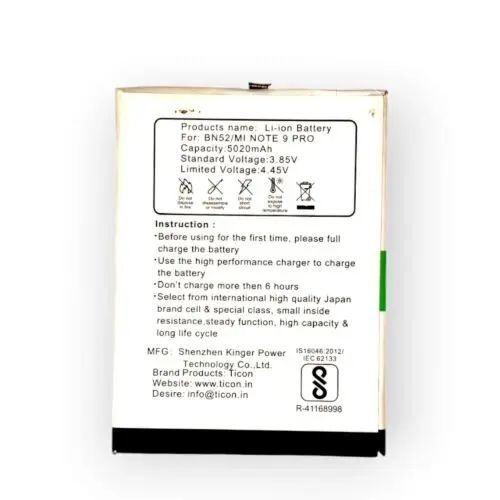The Naru Mobile Battery for Redmi Note 9 Pro BN52 Ticon Battery is a high-quality replacement battery designed to provide long-lasting power for your Redmi Note 9 Pro smartphone. This battery offers a reliable and durable solution for extending your device’s battery life.