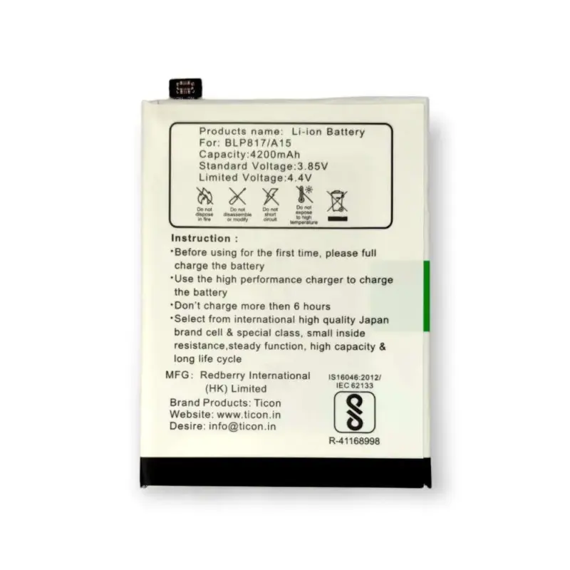 Oppo A15 For Ticon BLP817 Mobile Battery High Quality Power Up For 3.85V/4200mAh & Oppo A15 Mobile Phone Ticon Battery Capacity Long Lasting Backup Compatible With Mobile Japan Brand Cell Best Quality Mobile Phone Accessories Mobile Battery Reliable Performance Genuine Original Accessories