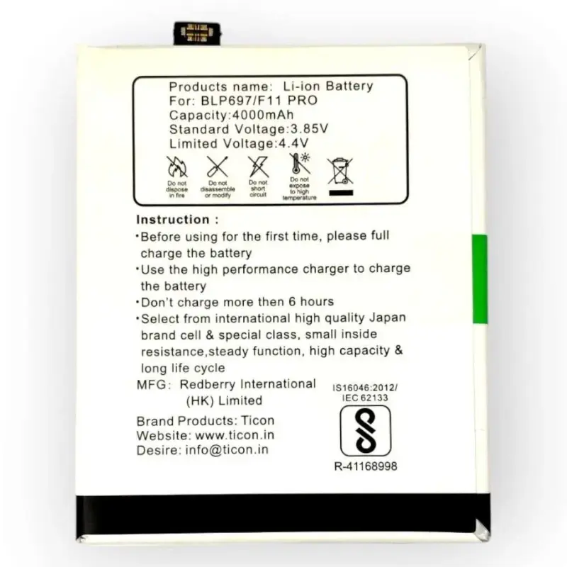 The OPPO F11 Pro BLP697 mobile boasts a robust Ticon Li-ion battery with a 4000mAh capacity and operates at 3.85V, ensuring enduring power for your device. This high-capacity battery delivers reliable performance, offering users a dependable and long-lasting mobile experience with the OPPO F11 Pro smartphone.