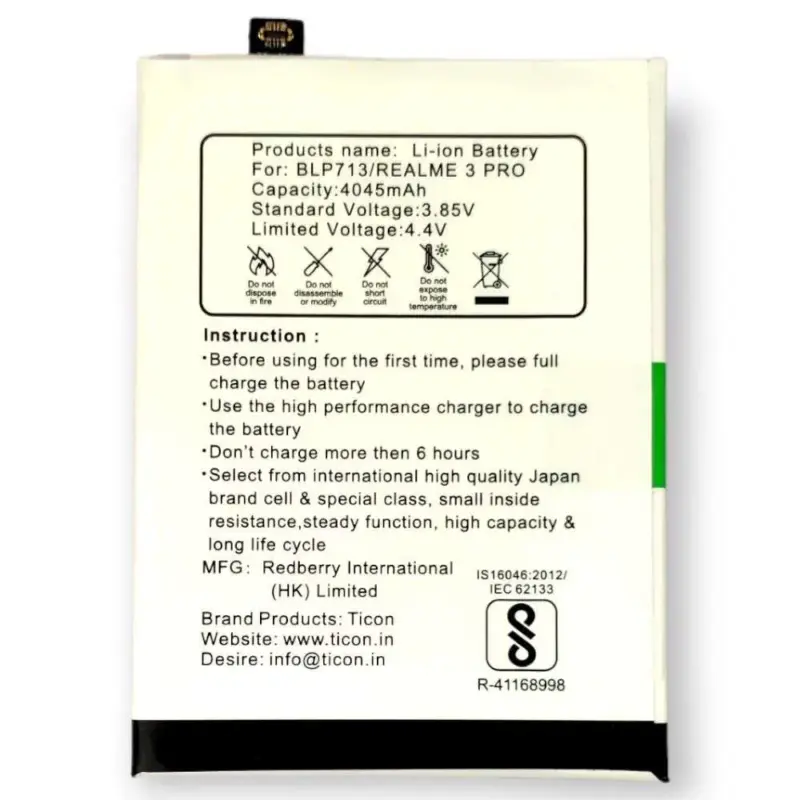 The Realme 3 Pro BLP713 features a durable Ticon Li-ion battery, offering a commendable 4045mAh capacity at 3.85V. This robust power source assures prolonged usage, enabling users to engage in extensive tasks and entertainment without frequent recharges, ensuring a reliable and enduring mobile experience.