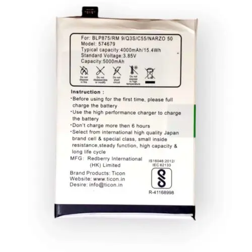 The Ticon BLP-875 Power-UP Mobile Phone Battery is a high-quality replacement battery designed specifically for the Realme Narzo 50 and C55 smartphones. It offers a long-lasting battery life and ensures reliable performance for your device.
