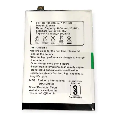 The Ticon BLP-905 Power-UP Mobile Phone Battery is a high-quality replacement battery designed specifically for the OPPO Reno 7 PRO 5G smartphone. It offers a long-lasting battery life, ensuring you can enjoy extended usage without frequent recharging. This battery is a reliable and affordable option to restore your device’s battery performance.