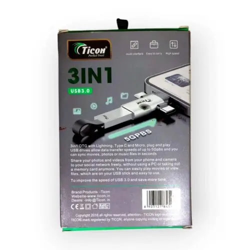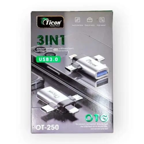 The Ticon OT-250 3-in-1 Lightning, Micro, Type-C OTG (On-the-Go) USB is a versatile and convenient accessory that allows you to connect various USB devices to your compatible smartphone or tablet. With its three-in-one design, this eliminates the need to carry multiple cables for different devices.