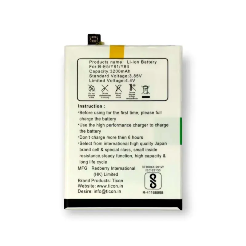 Ticon Battery For Vivo Y81 Y83 Mobile Battery Ticon B-E5/Y81/Y83 Mobile Battery High Quality Power Up For 3.85V/3200mAh & Vivo Mobile Phone Ticon Battery Capacity Long Lasting Backup Compatible With Mobile Japan Brand Cell Best Quality Mobile Phone Accessories Mobile Battery Reliable Performance Genuine Original Accessories